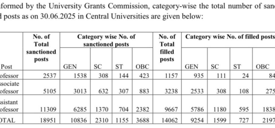 नई दिल्ली। सरकार ने स्वीकार किया है कि उच्च शिक्षा में आरक्षित वर्गों के लिए संसद द्वारा 2006 में पारित अधिनियम के तहत निर्धारित पदों को भरने में भारी लंबित रिक्तियां हैं। यदि प्रोफेसर पद की बात की जाए तो […]